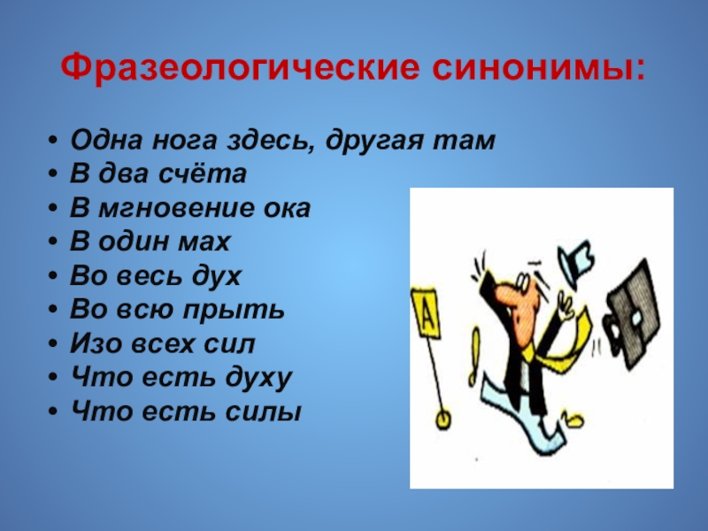 Фразеологические синонимы: Одна нога здесь, другая тамВ два счётаВ мгновение окаВ один махВо весь духВо всю прытьИзо всех силЧто