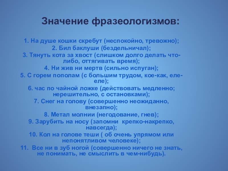 Значение фразеологизмов:1. На душе кошки скребут (неспокойно, тревожно);2. Бил баклуши (бездельничал);3. Тянуть кота за хвост (слишком долго