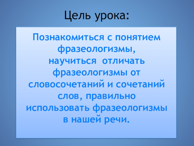 Цель урока:Познакомиться с понятием фразеологизмы, научиться отличать фразеологизмы от словосочетаний и сочетаний слов, правильно использовать фразеологизмы в