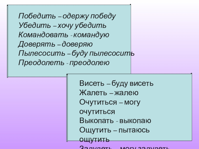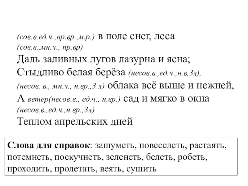 Слова для справок: зашуметь, повеселеть, растаять, потемнеть, поскучнеть, зеленеть, белеть, робеть, проходить, пролетать, веять, сушить