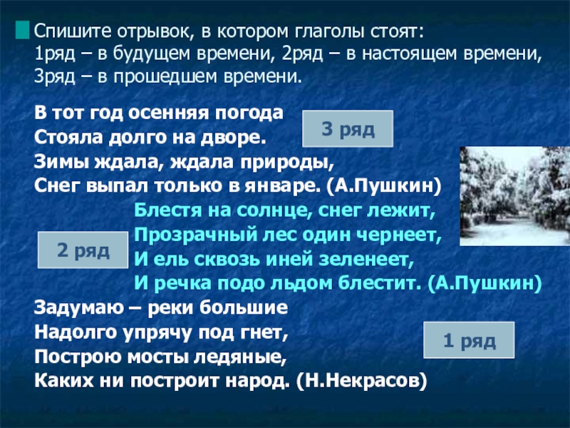 Снег выпал только в январе. (А.Пушкин)
