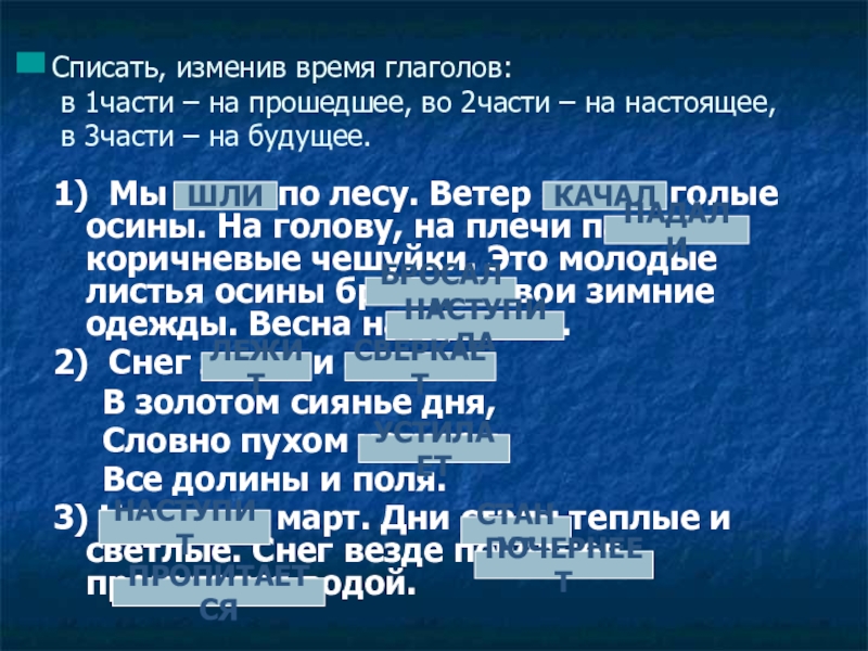 1) Мы идем по лесу. Ветер качает голые осины. На голову, на плечи падают коричневые чешуйки. Это молодые листья осины бросают свои зимние одежды. Весна наступает…