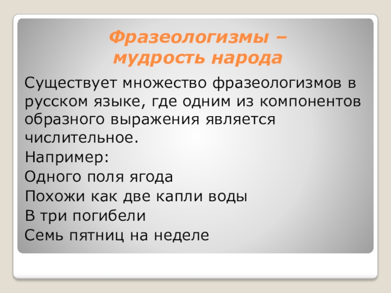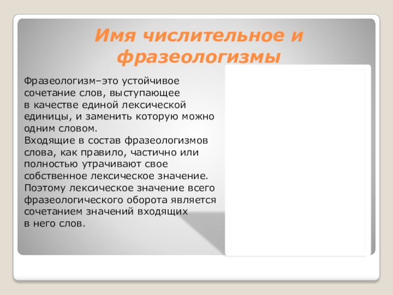 Имя числительное и фразеологизмыФразеологизм–это устойчивое сочетание слов, выступающее в качестве единой лексической единицы, и заменить которую можно