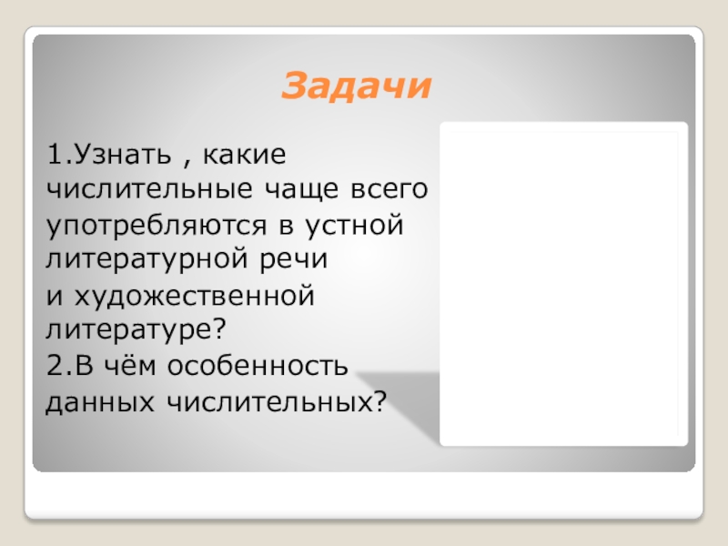Задачи1.Узнать , какие числительные чаще всего употребляются в устной литературной речи и художественной литературе? 2.В чём особенностьданных