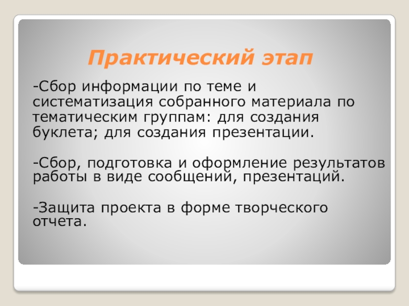 Практический этап-Сбор информации по теме и систематизация собранного материала по тематическим группам: для создания буклета; для создания