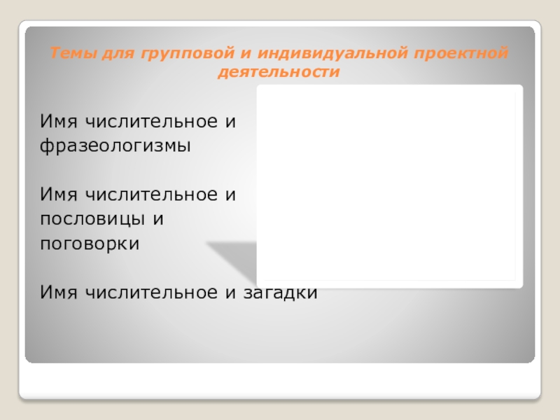 Темы для групповой и индивидуальной проектной  деятельности Имя числительное и фразеологизмыИмя числительное ипословицы и поговоркиИмя числительное