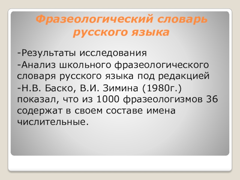 -Н.В. Баско, В.И. Зимина (1980г.) показал, что из 1000 фразеологизмов 36 содержат в своем составе имена числительные.