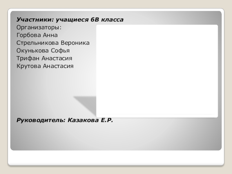 Участники: учащиеся 6В классаОрганизаторы:Горбова АннаСтрельникова ВероникаОкунькова СофьяТрифан АнастасияКрутова АнастасияРуководитель: Казакова Е.Р.