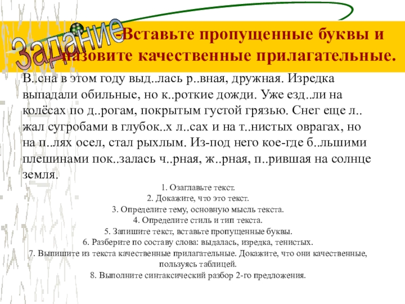 В..сна в этом году выд..лась р..вная, дружная. Изредка выпадали обильные, но к..роткие дожди. Уже езд..ли на колёсах по д..рогам, покрытым густой грязью. Снег еще л..жал сугробами в глубок..х л..сах и на т..нистых оврагах, но на п..лях осел, стал рыхлым. Из-под него кое-где б..льшими плешинами пок..залась ч..рная, ж..рная, п..рившая на солнце земля.