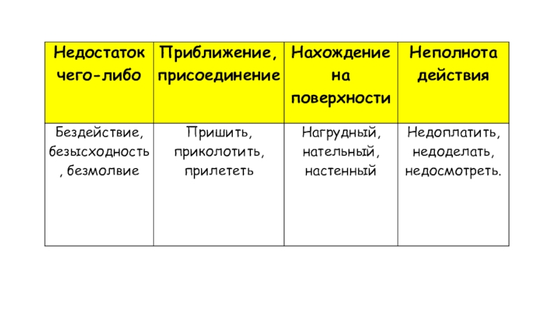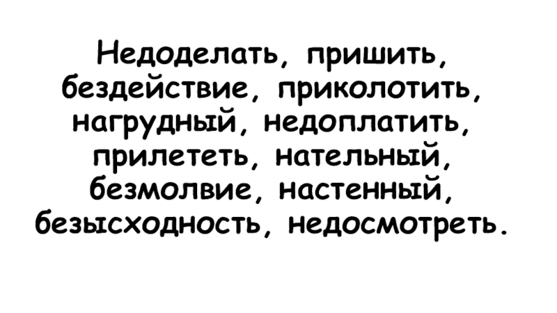 Слайд 6Недоделать, пришить, бездействие, приколотить, нагрудный, недоплатить, прилететь, нательный, безмолвие, настенный, безысходность,