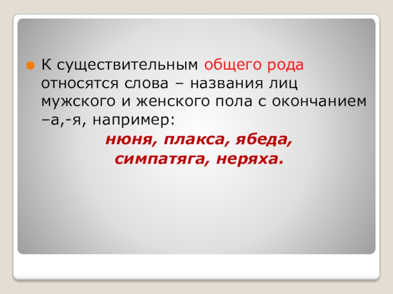 Слайд 11К существительным общего рода относятся слова – названия лиц мужского и
