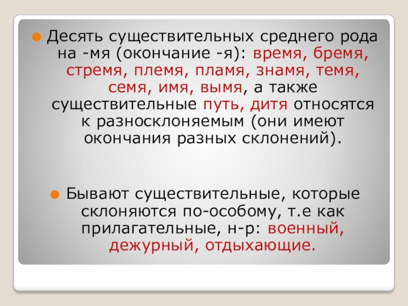 Слайд 19Десять существительных среднего рода на -мя (окончание -я): время, бремя, стремя, племя, пламя, знамя, темя,