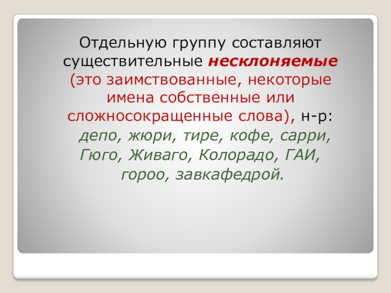 Слайд 20Отдельную группу составляют существительные несклоняемые (это заимствованные, некоторые имена собственные или