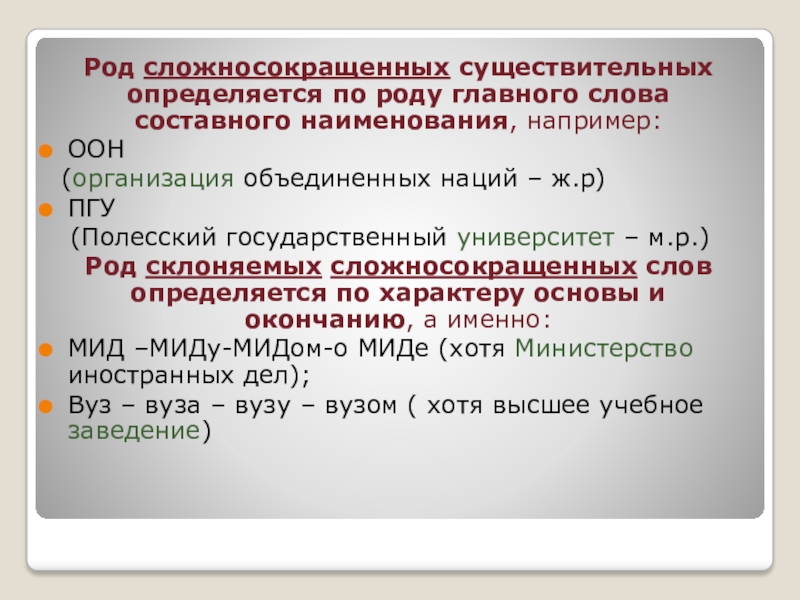 Род склоняемых сложносокращенных слов определяется по характеру основы и окончанию, а именно: