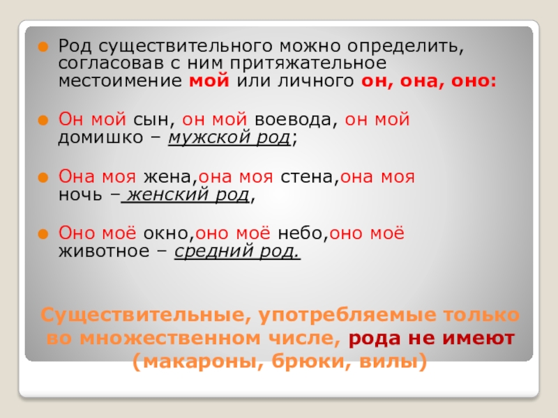 Слайд 9Существительные, употребляемые только во множественном числе, рода не имеют(макароны, брюки, вилы)