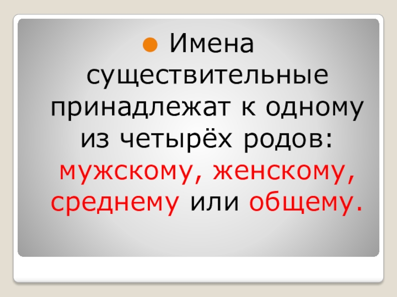 Слайд 8 Имена существительные принадлежат к одному из четырёх родов: мужскому, женскому, среднему