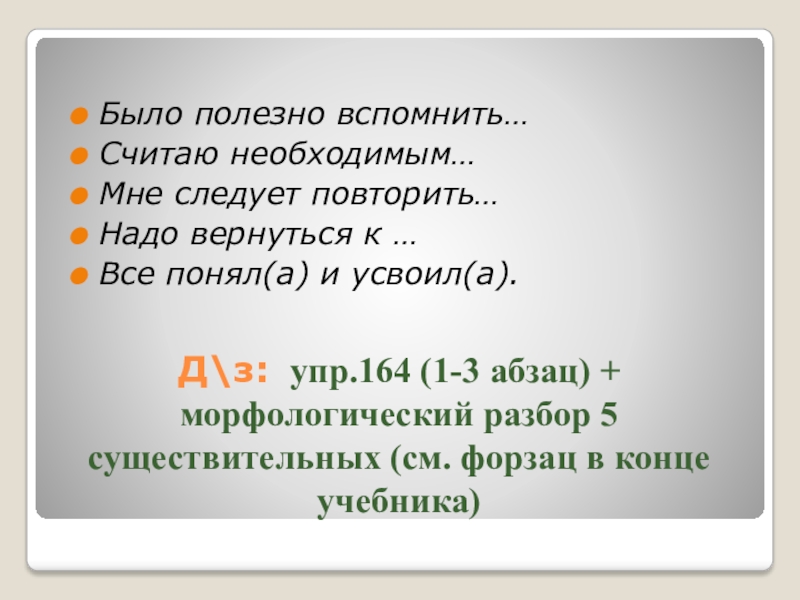 Слайд 26Д\з: упр.164 (1-3 абзац) + морфологический разбор 5 существительных (см. форзац