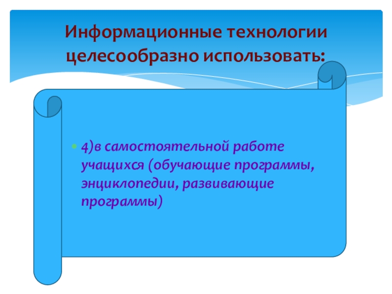 Информационные технологии целесообразно использовать:  4)в самостоятельной работе учащихся (обучающие программы, энциклопедии, развивающие программы)