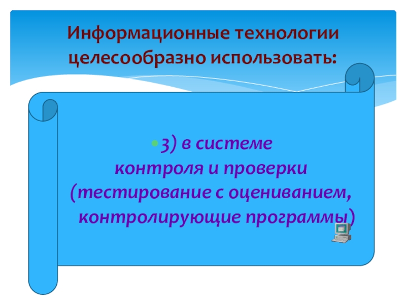 Информационные технологии целесообразно использовать:  3) в системе контроля и проверки (тестирование с оцениванием, контролирующие программы)