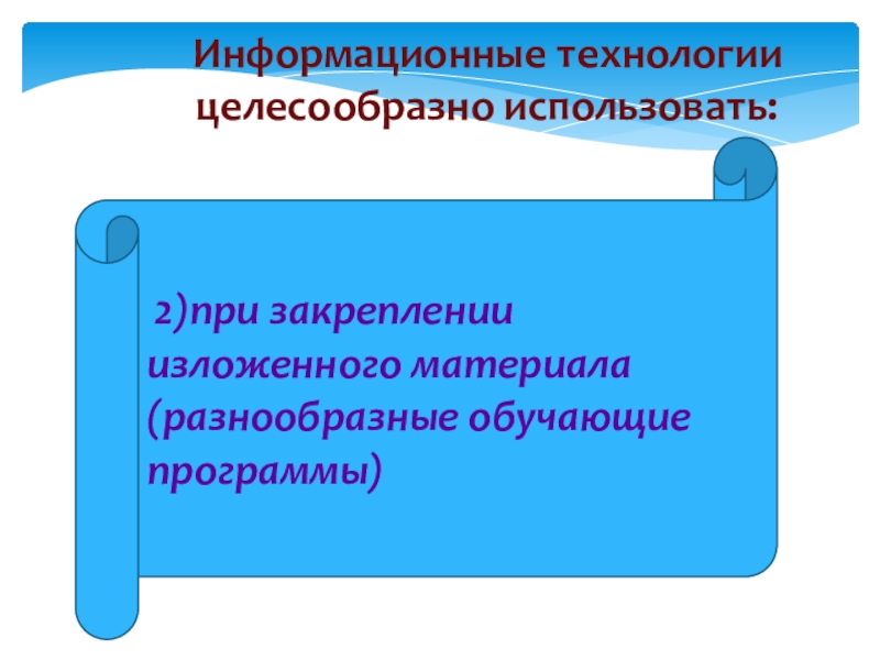 Информационные технологии целесообразно использовать:   2)при закреплении изложенного материала (разнообразные обучающие программы)