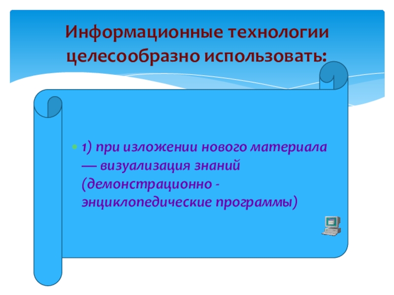 Информационные технологии целесообразно использовать:  1) при изложении нового материала — визуализация знаний (демонстрационно - энциклопедические