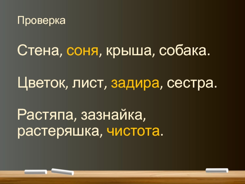 Слайд 20Проверка Стена, соня, крыша, собака. Цветок, лист, задира, сестра. Растяпа, зазнайка, растеряшка, чистота.
