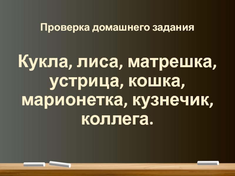 Слайд 5Проверка домашнего задания Кукла, лиса, матрешка, устрица, кошка, марионетка, кузнечик, коллега.