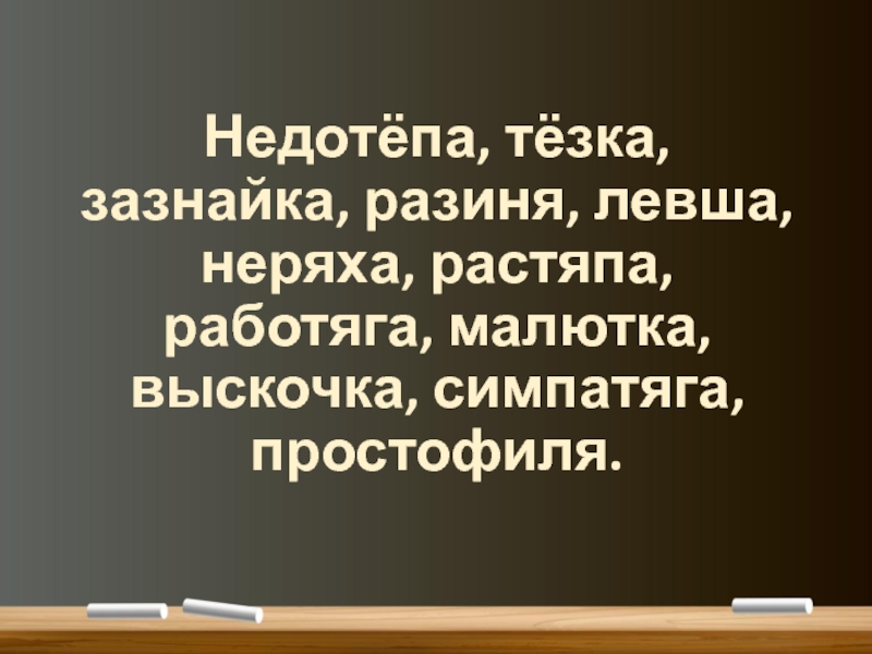 Слайд 23Недотёпа, тёзка, зазнайка, разиня, левша, неряха, растяпа, работяга, малютка, выскочка, симпатяга,