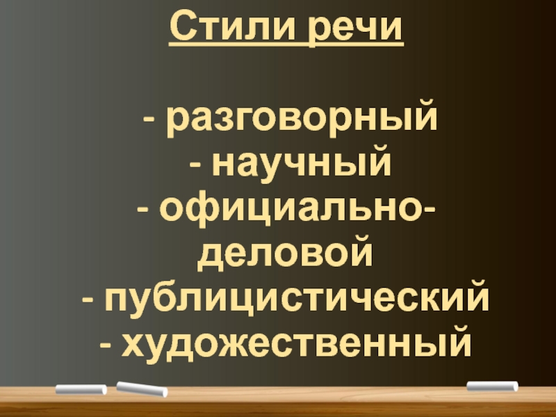 Слайд 25Стили речи - разговорный - научный - официально-деловой - публицистический - художественный