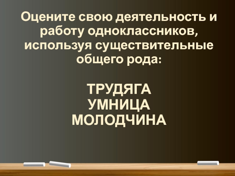 Оцените свою деятельность и работу одноклассников, используя существительные общего рода:  ТРУДЯГА УМНИЦА МОЛОДЧИНА