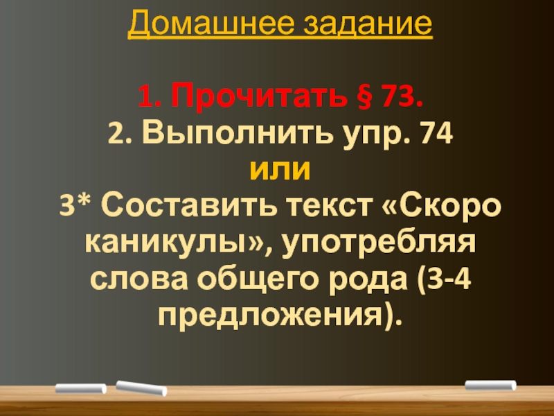 Домашнее задание  1. Прочитать § 73. 2. Выполнить упр. 74 или 3* Составить текст «Скоро каникулы»,