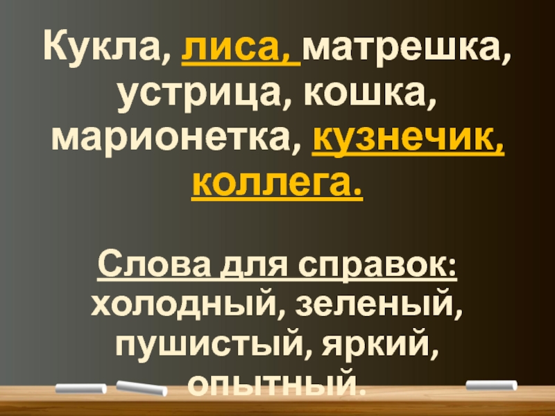 Слайд 7 Кукла, лиса, матрешка, устрица, кошка, марионетка, кузнечик, коллега. Слова для справок: холодный,