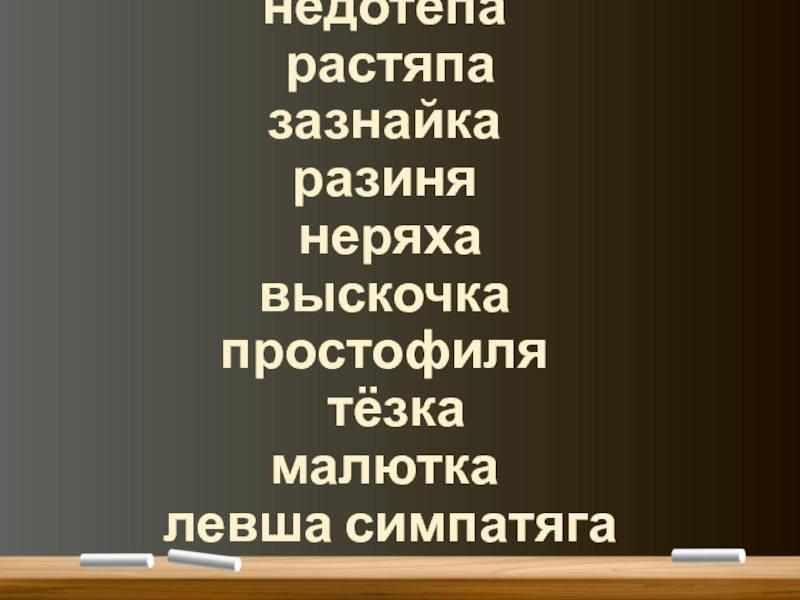 Слайд 24недотёпа растяпа зазнайка разиня неряха выскочка простофиля тёзка малютка левша симпатяга
