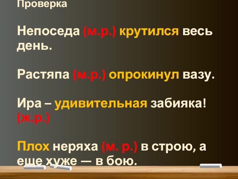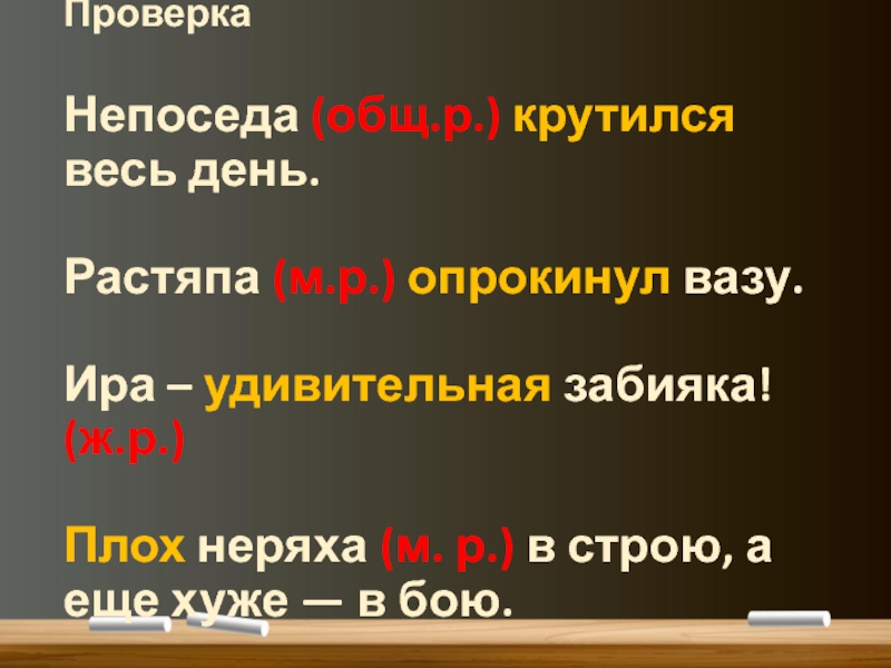 Слайд 18Проверка Непоседа (общ.р.) крутился весь день. Растяпа (м.р.) опрокинул вазу. Ира – удивительная забияка!