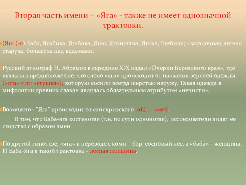 Слайд 4Вторая часть имени – «Яга» - также не имеет однозначной трактовки.