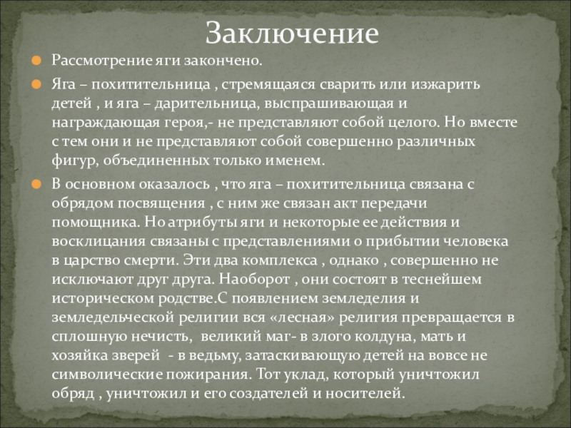 В основном оказалось , что яга – похитительница связана с обрядом посвящения , с ним же связан акт передачи помощника. Но атрибуты яги и некоторые ее действия и восклицания связаны с представлениями о прибытии человека в царство смерти. Эти два комплекса , однако , совершенно не исключают друг друга. Наоборот , они состоят в теснейшем историческом родстве.С появлением земледелия и земледельческой религии вся «лесная» религия превращается в сплошную нечисть, великий маг- в злого колдуна, мать и хозяйка зверей - в ведьму, затаскивающую детей на вовсе не символические пожирания. Тот уклад, который уничтожил обряд , уничтожил и его создателей и носителей.