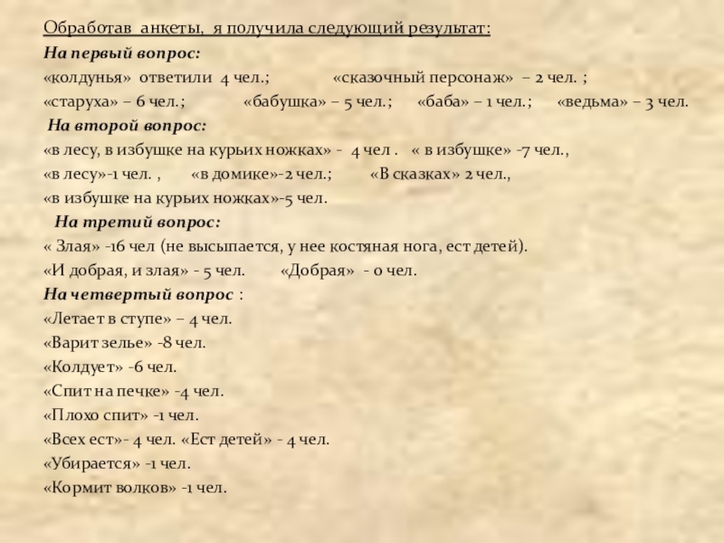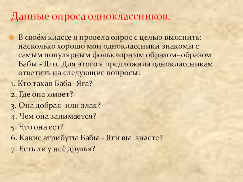 мои одноклассники знакомы с самым популярным фольклорным образом–образом Бабы - Яги. Для этого я предложила одноклассникам ответить на следующие вопросы:
