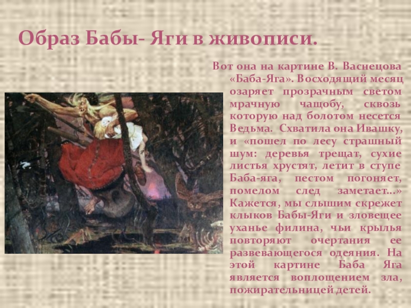 Восходящий месяц озаряет прозрачным светом мрачную чащобу, сквозь которую над болотом несется Ведьма. Схватила она Ивашку, и «пошел по лесу страшный шум: деревья трещат, сухие листья хрустят, летит в ступе Баба-яга, пестом погоняет, помелом след заметает...» Кажется, мы слышим скрежет клыков Бабы-Яги и зловещее уханье филина, чьи крылья повторяют очертания ее развевающегося одеяния. На этой картине Баба Яга является воплощением зла, пожирательницей детей.