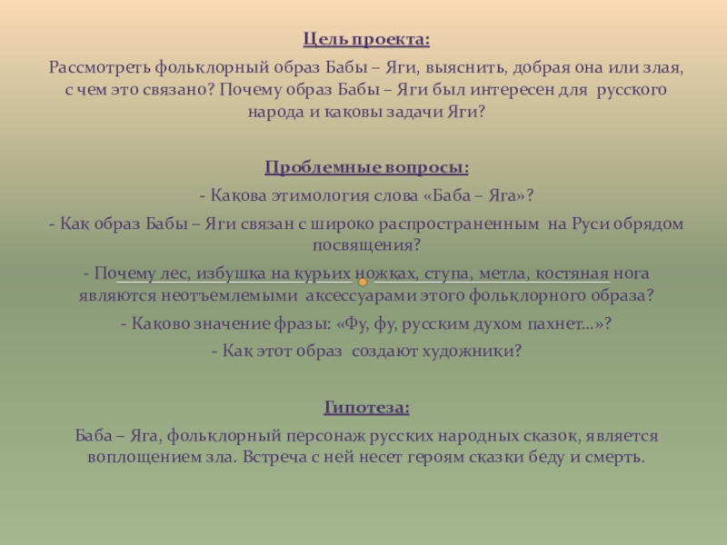 Баба – Яга, фольклорный персонаж русских народных сказок, является воплощением зла. Встреча с ней несет героям сказки беду и смерть.