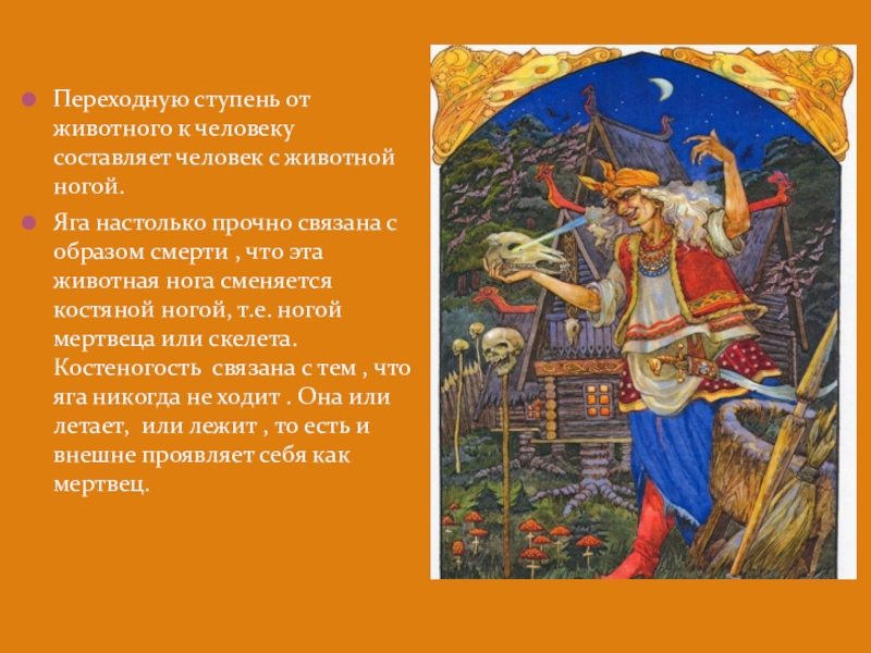 Яга настолько прочно связана с образом смерти , что эта животная нога сменяется костяной ногой, т.е. ногой мертвеца или скелета. Костеногость связана с тем , что яга никогда не ходит . Она или летает, или лежит , то есть и внешне проявляет себя как мертвец.