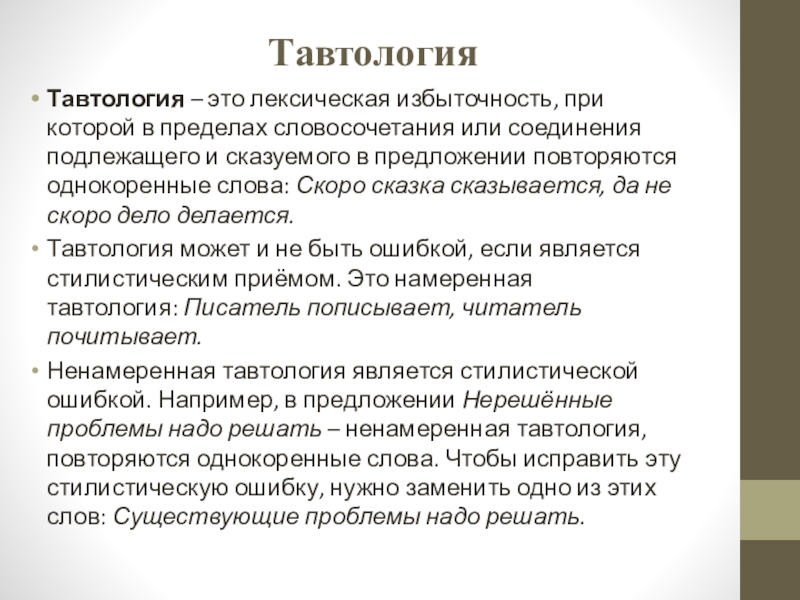 Тавтология – это лексическая избыточность, при которой в пределах словосочетания или соединения