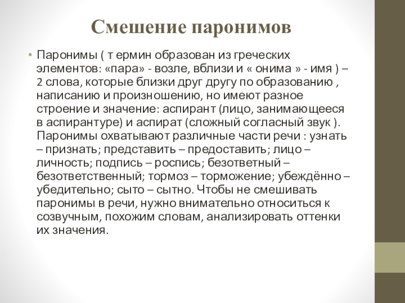 - возле, вблизи и « онима » - имя ) – 2 слова, которые близки друг другу по образованию , написанию и произношению, но имеют разное строение и значение: аспирант (лицо, занимающееся в аспирантуре) и аспират (сложный согласный звук ). Паронимы охватывают различные части речи : узнать – признать; представить – предоставить; лицо – личность; подпись – роспись; безответный – безответственный; тормоз – торможение; убеждённо – убедительно; сыто – сытно. Чтобы не смешивать паронимы в речи, нужно внимательно относиться к созвучным, похожим словам, анализировать оттенки их значения.