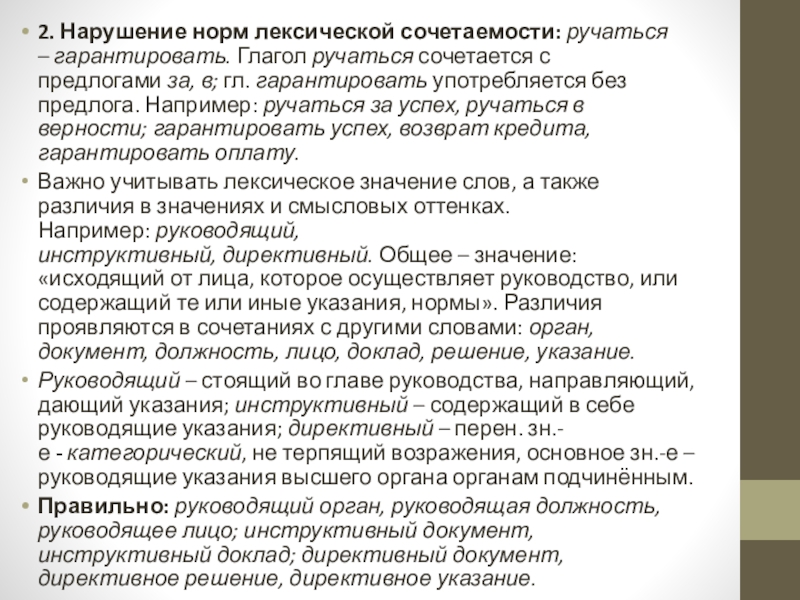 Важно учитывать лексическое значение слов, а также различия в значениях и смысловых оттенках. Например: руководящий, инструктивный, директивный. Общее – значение: «исходящий от лица, которое осуществляет руководство, или содержащий те или иные указания, нормы». Различия проявляются в сочетаниях с другими словами: орган, документ, должность, лицо, доклад, решение, указание.