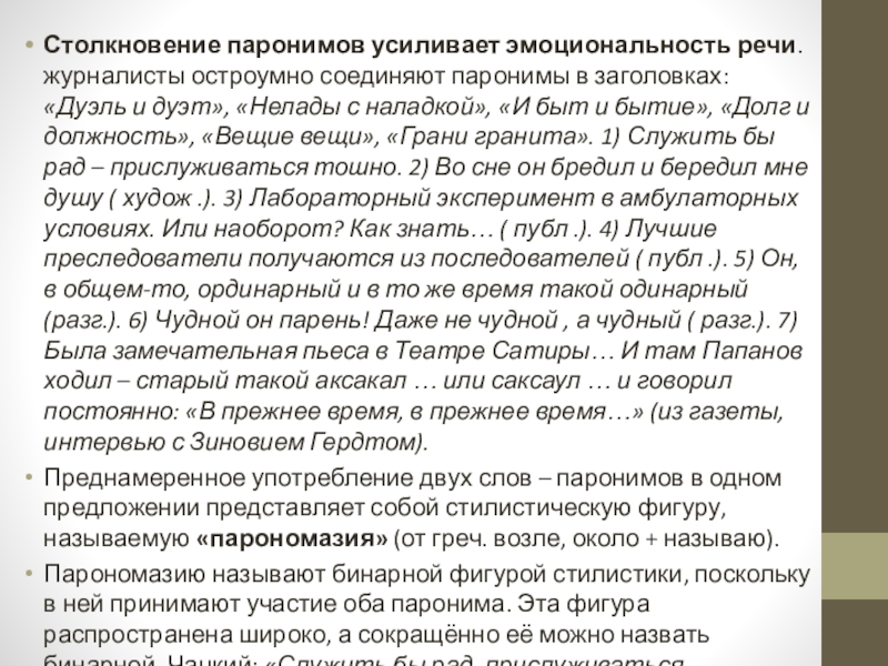 «Дуэль и дуэт», «Нелады с наладкой», «И быт и бытие», «Долг и должность», «Вещие вещи», «Грани гранита». 1) Служить бы рад – прислуживаться тошно. 2) Во сне он бредил и бередил мне душу ( худож .). 3) Лабораторный эксперимент в амбулаторных условиях. Или наоборот? Как знать… ( публ .). 4) Лучшие преследователи получаются из последователей ( публ .). 5) Он, в общем-то, ординарный и в то же время такой одинарный (разг.). 6) Чудной он парень! Даже не чудной , а чудный ( разг.). 7) Была замечательная пьеса в Театре Сатиры… И там Папанов ходил – старый такой аксакал … или саксаул … и говорил постоянно: «В прежнее время, в прежнее время…» (из газеты, интервью с Зиновием Гердтом).