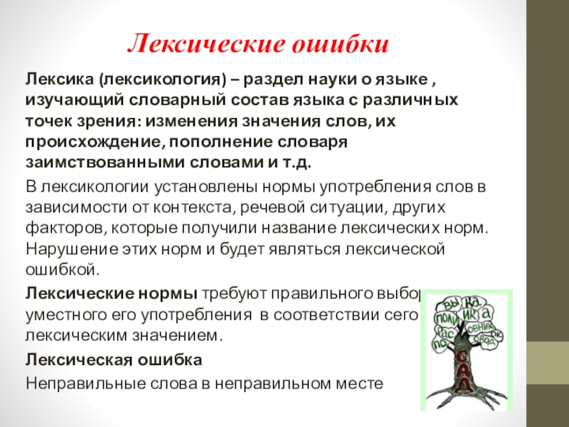 В лексикологии установлены нормы употребления слов в зависимости от контекста, речевой ситуации, других факторов, которые получили название лексических норм. Нарушение этих норм и будет являться лексической ошибкой.