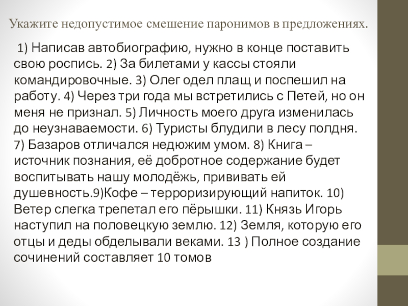 в конце поставить свою роспись. 2) За билетами у кассы стояли командировочные. 3) Олег одел плащ и поспешил на работу. 4) Через три года мы встретились с Петей, но он меня не признал. 5) Личность моего друга изменилась до неузнаваемости. 6) Туристы блудили в лесу полдня. 7) Базаров отличался недюжим умом. 8) Книга – источник познания, её добротное содержание будет воспитывать нашу молодёжь, прививать ей душевность.9)Кофе – терроризирующий напиток. 10) Ветер слегка трепетал его пёрышки. 11) Князь Игорь наступил на половецкую землю. 12) Земля, которую его отцы и деды обделывали веками. 13 ) Полное создание сочинений составляет 10 томов
