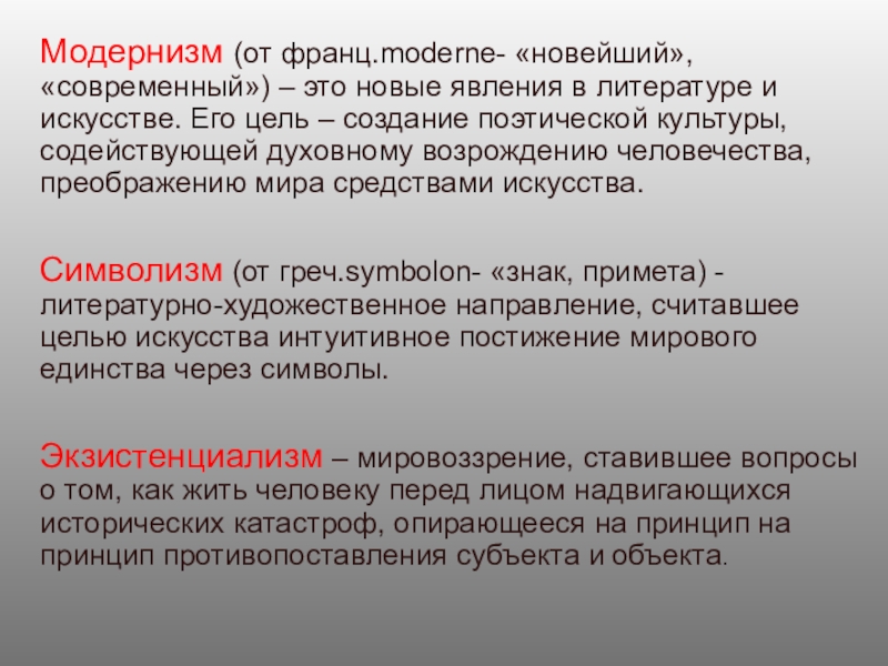 Слайд 28Модернизм (от франц.moderne- «новейший», «современный») – это новые явления в литературе