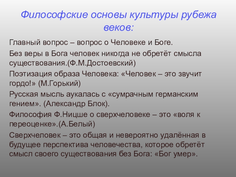 Философия Ф.Ницше о сверхчеловеке – это «воля к переоценке».(А.Белый)