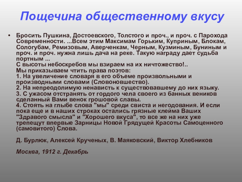 4. Стоять на глыбе слова "мы" среди свиста и негодования. И если пока еще и в наших строках остались грязные клейма Ваших "Здравого смысла" и "Хорошего вкуса", то все же на них уже трепещут впервые Зарницы Новой Грядущей Красоты Самоценного (самовитого) Слова.