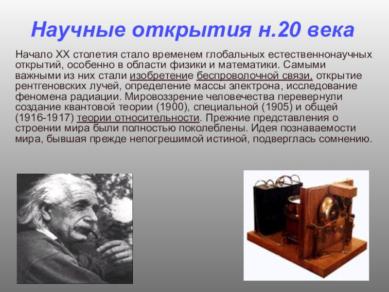 открытий, особенно в области физики и математики. Самыми важными из них стали изобретение беспроволочной связи, открытие рентгеновских лучей, определение массы электрона, исследование феномена радиации. Мировоззрение человечества перевернули создание квантовой теории (1900), специальной (1905) и общей (1916-1917) теории относительности. Прежние представления о строении мира были полностью поколеблены. Идея познаваемости мира, бывшая прежде непогрешимой истиной, подверглась сомнению.